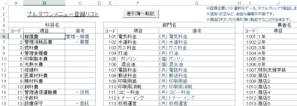 - リストシートで登録した項目名は、「差引簿へ転記」ボタンで差引簿に転記することができます。