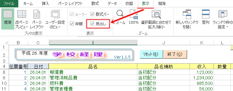 見出し(行列名)の表示状態の時は自動計算やマクロが停止しますので、自由な編集が可能です。