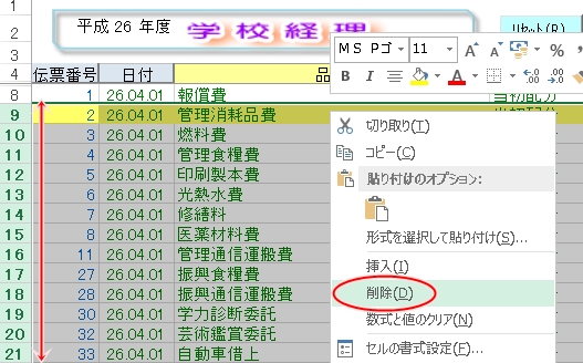 ○9行目以降を選択し、マウス右クリックのメニューから「削除{D}」で一括削除します。