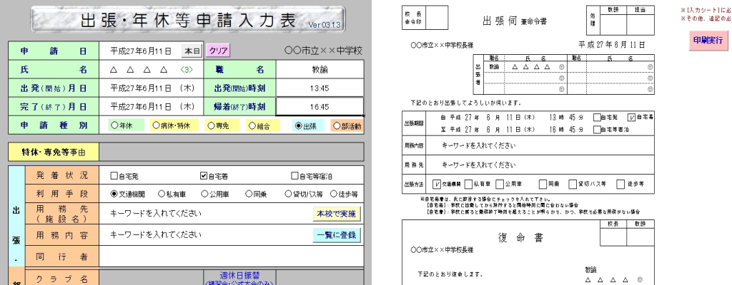 - 各申請書の「印刷実行」ボタンで印刷すると、出張実績.xlsまたは服務実績.xlsを自動作成します。