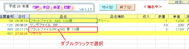 ○抽出中画面では、品名欄をダブルクリックすることでコピーし、入力行に転記します。