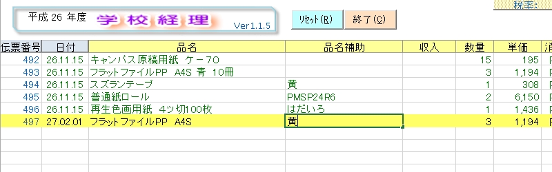 ※入力したデータは、品名欄と科目名から業者名のいずれかに入力があったときにデータとして登録されます。