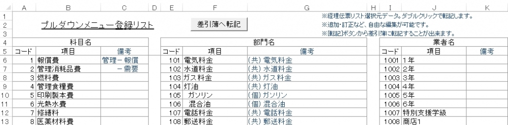○リストシートには、経理伝票シートで入力する科目名・部門名・業者名の項目を登録します。